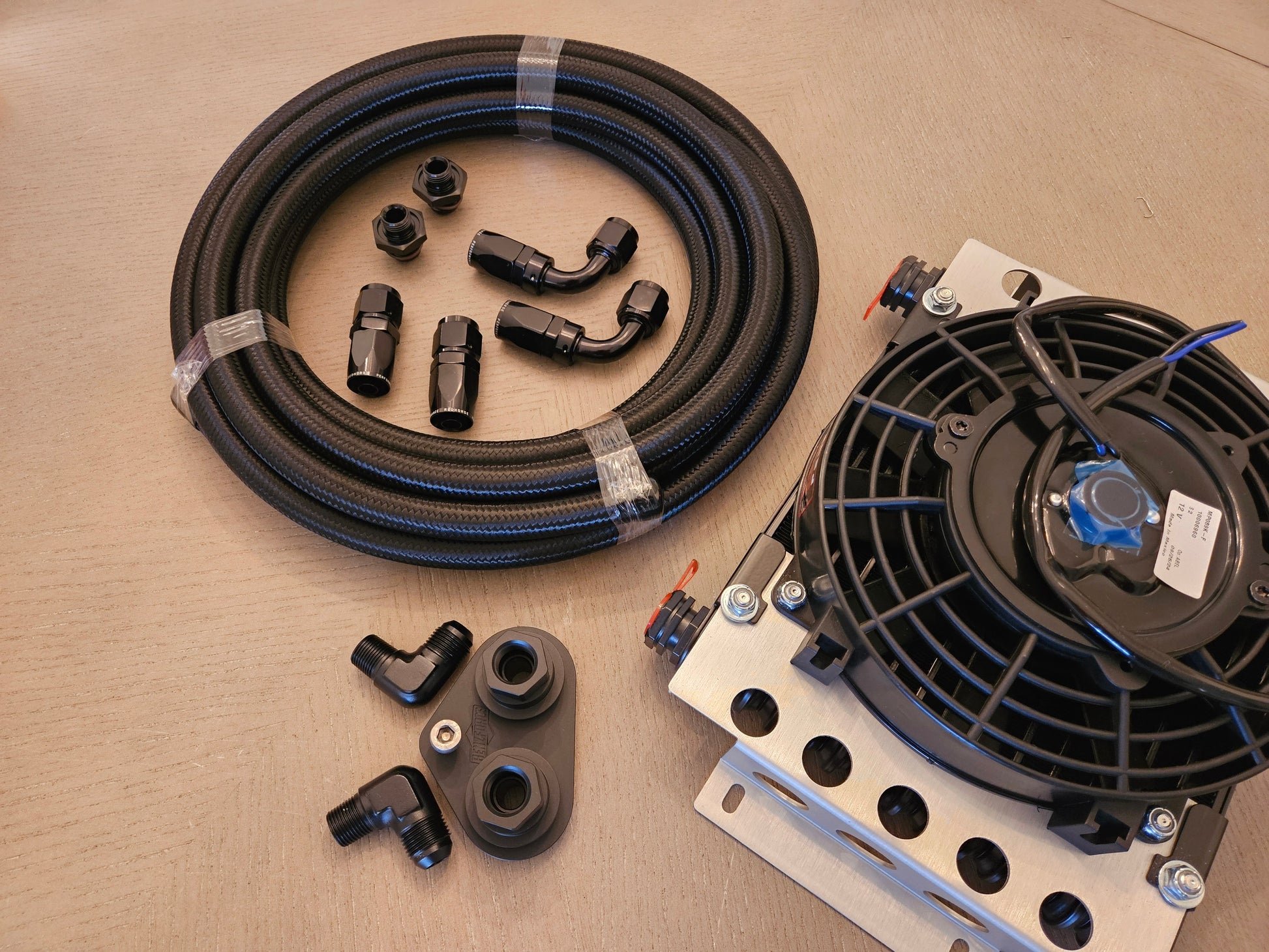 Cooler assembly includes fan mounted cooler, aluminum -8AN fittings and two -8AN x 1/2″ hose barb fittings